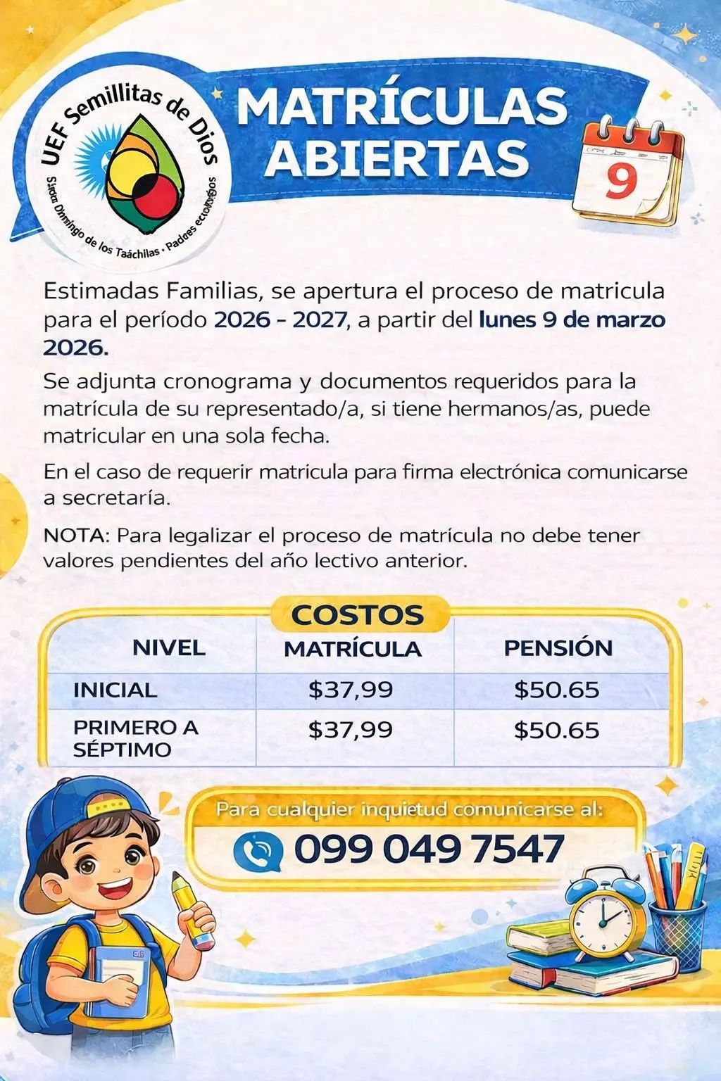 La Unidad Educativa Fiscomisional Semillitas de Dios ofrece educación en Educación Inicial y Educación General Básica, acompañando a niños y niñas desde los 3 años hasta 7.º año, con una propuesta que promueve el desarrollo integral y habilidades fundamentales para la vida.